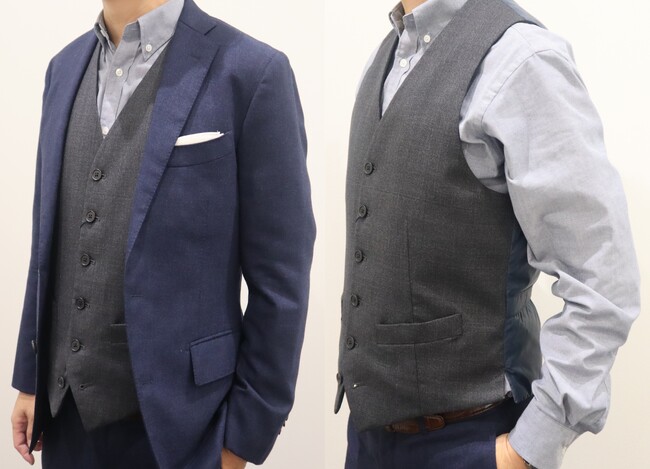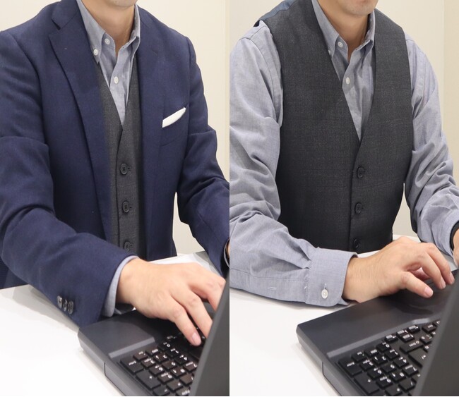 冬の防寒対策として、スーツの下にニットやベストなどカジュアルテイストのアイテムを着用することが定番になりつつあります。そのような中、会議や商談時でもスーツスタイルに相応しい暖かいインナーを着用したいなどのお客様の要望を受け、この度スーツライクな「キレイめ中綿ジレ・ダウンジレ」を企画しました。今回のジレは、前身頃にストレッチ性に優れた表地と機能性中綿「ヒーテス」を使用したジレと、350年以上の歴史をもつイタリアの老舗生地メーカー「カノニコ」の生地を使用したダウンジレの2型を展開します。
