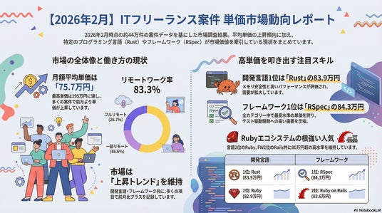 INSTANTROOM株式会社(本社:東京都渋谷区、代表取締役:曽根弘介)が運営する、フリーランスエンジニア・ITフリーランスの案件検索サイト「フリーランスボード(https://freelance-board.com)」は2026年2月のフリーランス案件の単価における市場動向の調査結果を発表いたします。