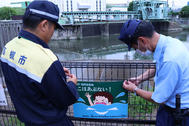 高槻市では、子どもの水の事故を防止するため、7月1日の国民安全の日に合わせ、毎年、市内の水路やため池など水辺に設置された看板やフェンス等が老朽化していないかなどを点検し、必要に応じて看板の再設置や補修をしています。