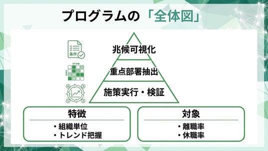 本プログラムは、高ストレス傾向比率を「説明可能な形」で運用し、重点部署の優先順位付けと予防的対策を継続運用できる状態へ整備します。