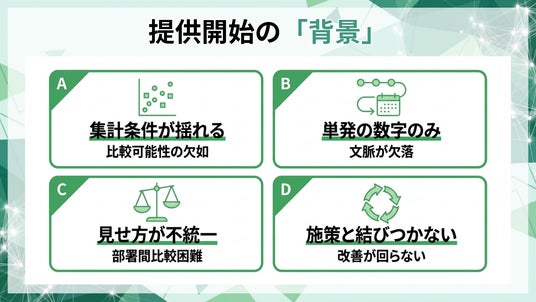 一方で現場では、集計条件が揺れる、単発の数字だけが共有されて文脈が欠落する、部署間比較の見せ方が統一されない、施策と結びつかず改善が回らない、といった課題が起きがちです。