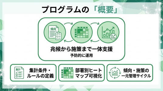 本プログラムは、高ストレス「傾向」比率を、集計条件を明確化したうえで部門別・時系列で管理し、重点部署の改善運用までを支援するプログラムです。