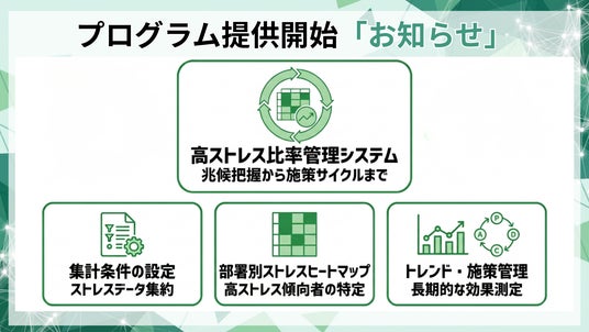 本プログラムは、高ストレス傾向比率を、集計条件と運用ルールを揃えたうえで、部門別・時系列で管理し、施策実行と検証までを支援します。