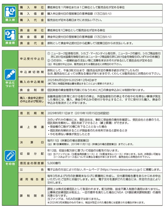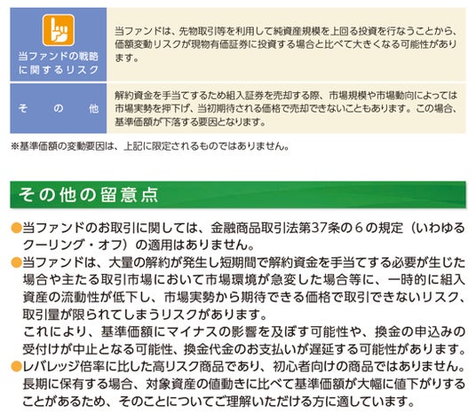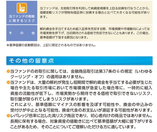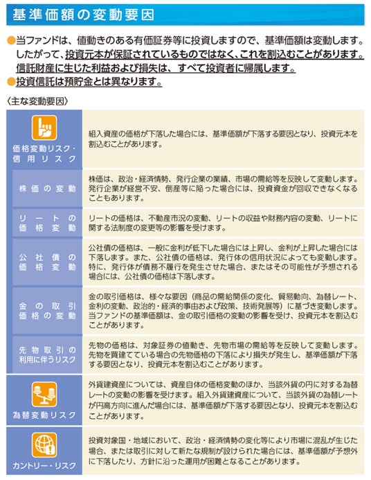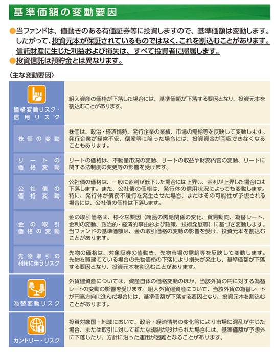- 投資信託は値動きのある有価証券等に投資しますので、基準価額は大きく変動します。したがって、投資元本が保証されているものではありません。信託財産に生じた利益および損失はすべて投資者に帰属します。投資信託は預貯金とは異なります。