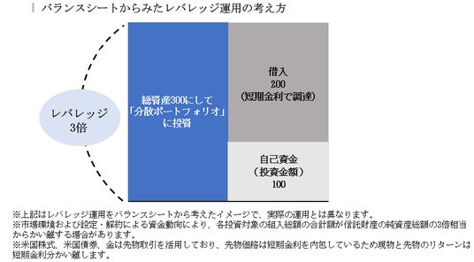 3倍のレバレッジをバランスシートから考えると自己資金(投資金額)100に対して借入で200を調達し、総資産を300にして「分散ポートフォリオ」に投資していると考えられます。実際には主に先物を活用して3倍のレバレッジをかけているので、理論上は先物価格算出における短期金利の部分が借入金利となります。よって投資収益はレバレッジ3倍の分散ポートフォリオのリターンから短期金利を引いた分となります。