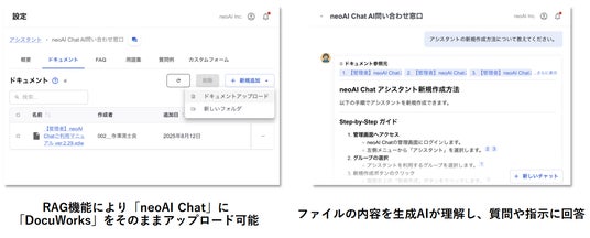 図2:「neoAI Chat」の画面イメージ。RAG機能により「DocuWorks」をアップロードすると生成AIが文書の内容を理解し、質問や指示に回答する。