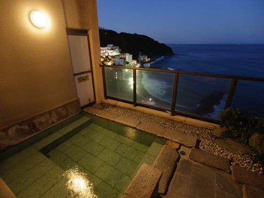 当館は熱川温泉の高台に位置し、全客室、相模湾を望むオーシャンビューの大パノラマをお楽しみいただけます。眼前に広がるきらめく海の眺望は、幻想的なムーンロードや美しい朝焼けなど、時間と共に移り変わります。熱川温泉で随一を誇る絶景をご堪能くださいませ。