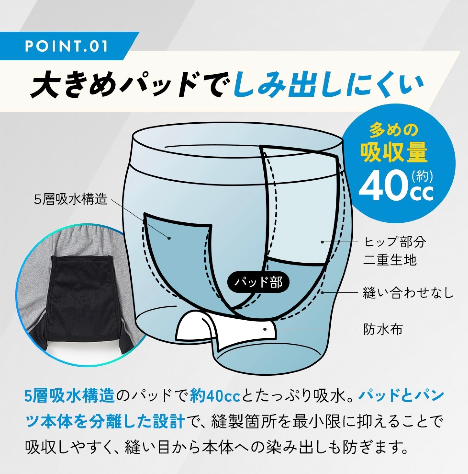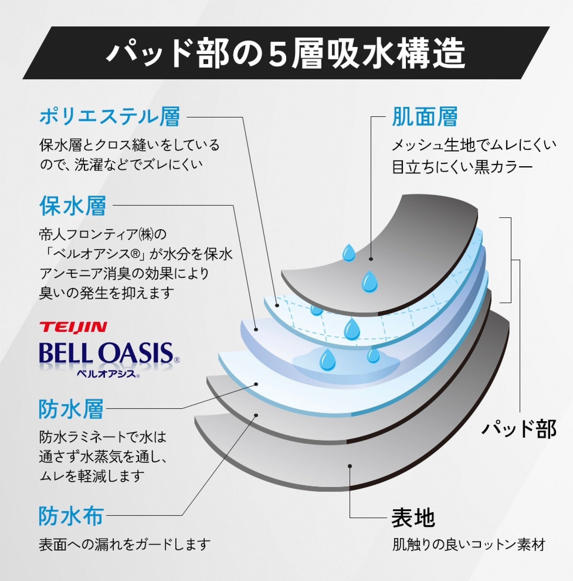 5層吸水構造のパッド部が約40ccと多めの尿も吸水。