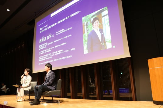 NXHD岸田執行役員(左)とアスエネ 西和田氏による企業講演