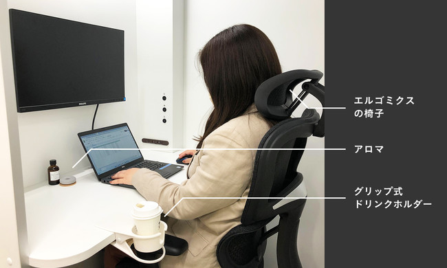 天井が空いているOne-Boだから、長時間いても苦になりません。気分に合わせたアロマ、お気に入りのドリンク、座りやすいイスを使い、オフィスにいながら自分だけの心地よい空間に。