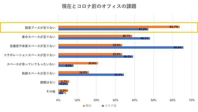 ■コロナ禍、多様化の進むオフィス最大の課題は「個室ブース不足」