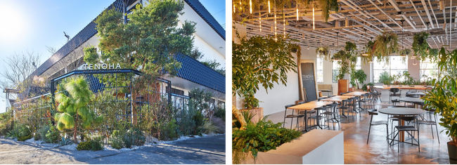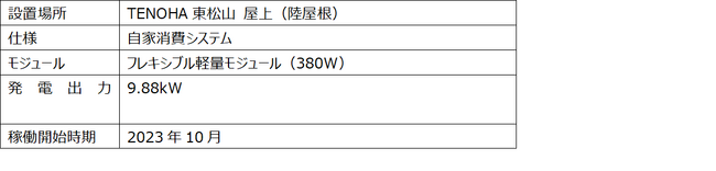 TENOHA東松山は、東急不動産が手掛ける、再生可能エネルギーを活用した地域共生プロジェクトの拠点施設です。2023年10月より建物屋根上にフレキシブル太陽光モジュール(※1)を設置して電力の自家消費を行っており、使用電力の約30%を再生可能エネルギーで賄っています。