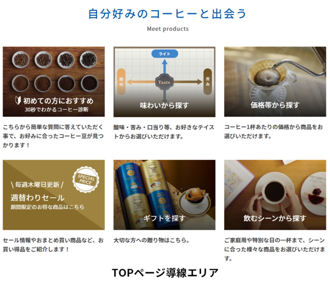 ご年配の既存ユーザーでも分かりやすく、TOPページには「味わい」「価格帯」「ギフト」「飲用シーン」など、目的別からすぐにイメージに合った商品を探せる導線を設置しています。