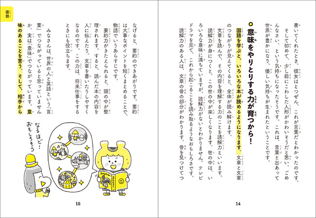 本の前半では、学校の授業で学ぶ「勉強の教科」を、本の後半では、やる気・続ける力・思いやる力などの点数では表せない心の強さを「心の教科」と名付けて紹介。得意な教科から読むと「私は、こんなことができるんだ!」と自信がつきます。一方、苦手な教科から読むと「この教科をがんばると、こんなことができるようになるんだ!」と学ぶ動機付けになります。