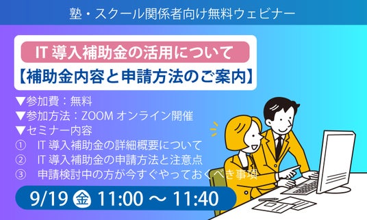 学習塾・放課後等デイサービスのICT教材『天神』を開発・提供する株式会社タオ(本社:滋賀県草津市、代表取締役:黒澤慶昭)は、『天神』の新規導入を検討されている経営者様を対象に、「IT導入補助金2025」を活用して導入費用を大幅に削減する方法を解説する無料オンラインセミナーを、2025年9月19日(金)に開催します。本年も公式認定された補助対象ツール『天神』について、申請の具体的な手順や注意点を専門家が40分で解説し、コストを理由に導入を迷われていた経営者様のDX推進を強力に後押しします。