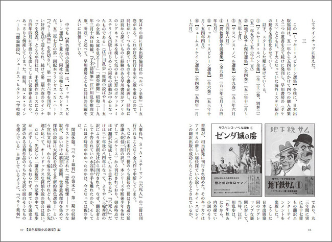 著者は翻訳ミステリの解説や書評を多数執筆している川出正樹氏。足かけ七年にも及ぶ雑誌連載にあたって収集した資料は多岐に亘り、本書で紹介する翻訳ミステリ叢書全巻を一覧にしたカラー口絵を始め、本文中の図版も、書影はもちろん投げ込みの案内や雑誌に掲載された広告まで――それでも精選のうえ150点以上を収録しています。