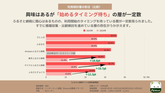 マイナビふるさと納税も16.0%から35.7%へ伸び、比較検討を進めながら利用開始のきっかけを探す動きが強まっていることが読み取れます。