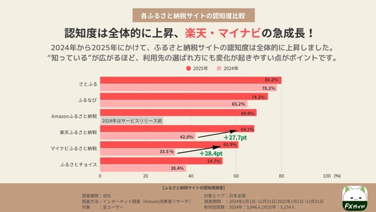 2024年から2025年にかけて、ふるさと納税サイトの認知度は全体的に上昇しました。