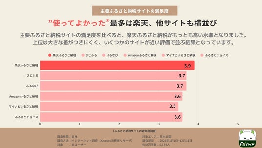 主要ふるさと納税サイトの満足度(平均値)を比べると、もっとも高かったのは楽天ふるさと納税でした。次いで、さとふる・ふるなびが近い水準で続き、Amazonふるさと納税とふるさとチョイスも同程度の評価となっています。