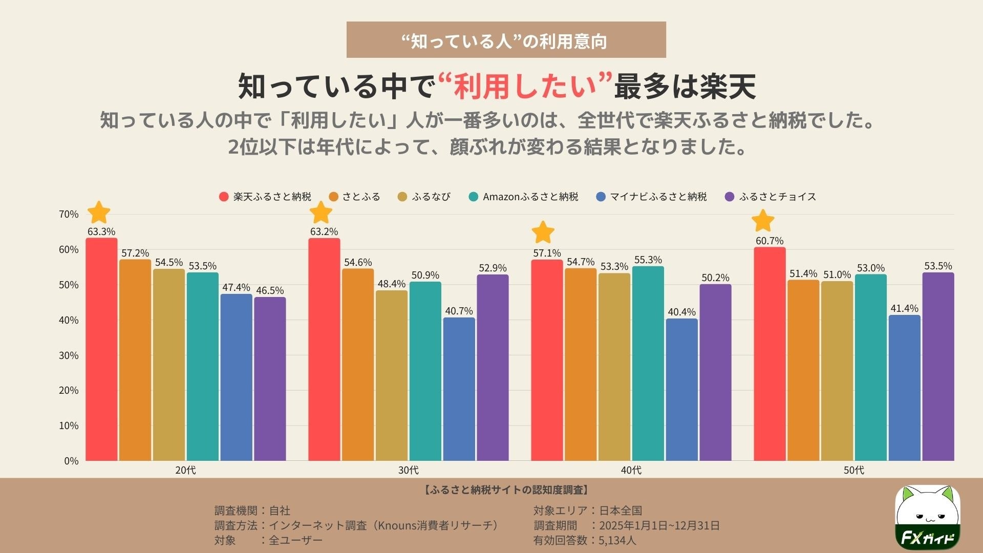 ・2025年の「次に利用したいサイト」(各サイトを知っている人の中で)は、20代~50代のすべての年代で「楽天ふるさと納税」が最多となり、20代 63.3%、30代 63.1%、40代 57.1%、50代 59.4%でした。