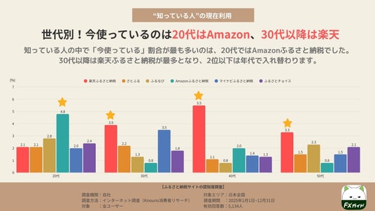 ・現在利用しているふるさと納税サイトは年代で傾向が分かれる結果となりました。各サイトを認知している人に限ると、20代は「Amazonふるさと納税」が4.8%で最多、30代~50代は「楽天ふるさと納税」が最多となりました。