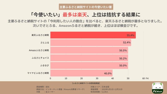 主要ふるさと納税サイトの「今利用したい人の割合」を比較すると、楽天ふるさと納税が55.4%で最多となりました。
