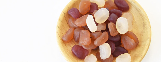 ひと粒1cm程度のひと口で食べやすいサイズ。不溶性食物繊維を含むこんにゃくをベースにしているため、お腹の健康維持や腸活にもおすすめです。