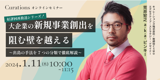 顧客企業のビジネス変革を成功に導くキュレーションズ株式会社(本社:東京都渋谷区、代表取締役社長:根本隆之、以下当社)は、『大企業の新規事業創出を阻む壁を越える~出島の手法を7つの分類で徹底解説~(好評回再放送シリーズ!)』を2024年1月11日(木)に開催いたします。