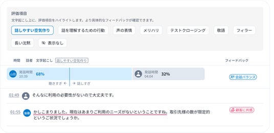 営業マネージャーが労力をかけていた「ヒアリング内容」「提案内容」「通話相手の反応」の確認を、AIが自動で要約することにより、迅速に評価できます。また、「会話の流れ」も可視化されるため、時間のかけ方のフィードバックも可能になります。