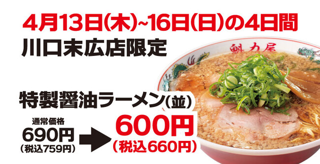 この度オープンを記念して、「川口末広店」にご来店いただいたお客様には、『特製醤油ラーメン(並)』を600円(税込660円)で販売いたします。