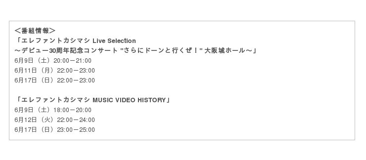 MTVは、エレファントカシマシが2017年3月に大阪城ホールで行ったデビュー30周年記念ワンマンライブ「"さらにドーンと行くぜ!" 大阪城ホール」の熱気あふれるパフォーマンスを集めた特別番組と歴代ビデオ特集を6月9日(土)20時から放送します。