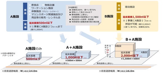 A施設として、飲食店、物販店舗、ワーケーション施設、マリンスポーツ関連施設や用品等の販売・レンタル店など。延床面積は原則500平方メートル 以下とし、1事業につきA施設2つ(A+A)、延床面積1,000平方メートル まで建築可能です。
