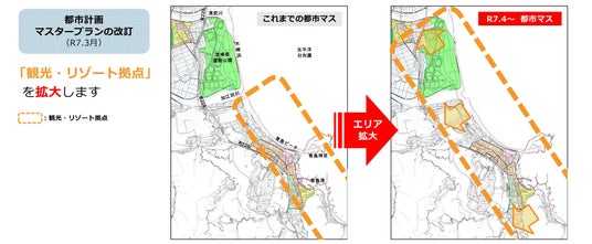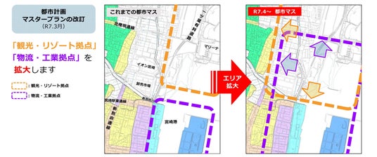 一ツ葉地区においては、令和7年3月に改訂される都市計画マスタープランを踏まえ、「観光・リゾート拠点」と「物流・工業拠点」のエリアが拡大されます。