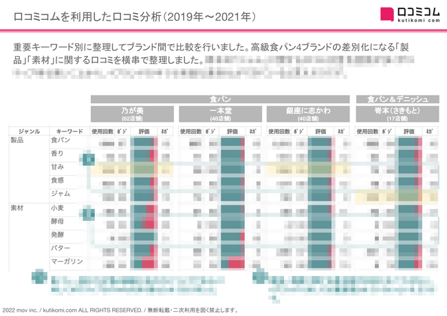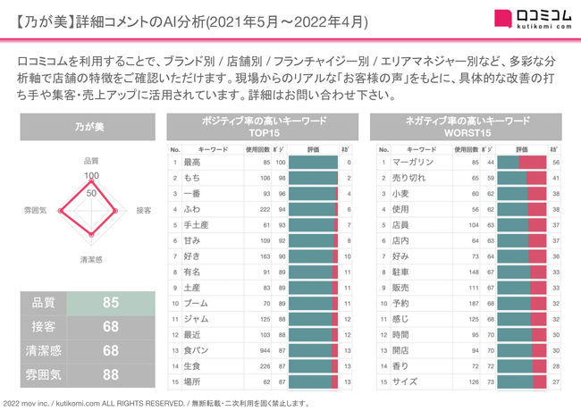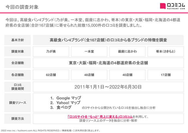 口コミサイトを”もっと”売上に変える『口コミコム』を運営する株式会社mov(代表取締役:渡邊 誠、本社:東京都渋谷区、以下mov)は、『口コミコム』独自のAI分析機能を用い、東京・大阪・福岡・北海道にある高級食パン専門店4ブランド(乃が美、一本堂、銀座に志かわ、嵜本)合計167店舗に寄せられた15,000件の口コミを分析してレポートを作成しました。