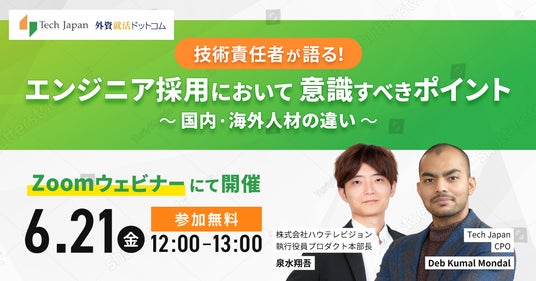 新卒学生のためのキャリア支援プラットフォーム「外資就活ドットコム」を運営する株式会社ハウテレビジョン(東京都港区、代表取締役:音成洋介)は、テクノロジー分野における高度インド人材に特化したHRTech事業を展開するTech Japan株式会社と、6月21日(金)12時より、エンジニア採用の市場、優秀なエンジニアのポイントをお伝えする無料ウェビナーを共同開催いたします。