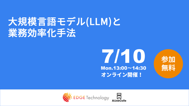 エッジテクノロジー株式会社(東京都千代田区 代表取締役社長:住本 幸士)は、AIジョブカレ講師である空閑俊文氏によるセミナーイベント「大規模言語モデル(LLM)と業務効率化手法」を7/10(月)13時に開催いたします。