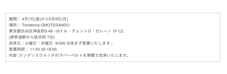 「Tendence ( テンデンス ) /株式会社テンデンスジャパン (本社 東京都渋谷区 )」は、唯一の旗艦店である「 Tendence OMOTESANDO(テンデンス表参道 )」にてテンデンスウォッチのラバーベルトを無償で洗浄する 『ラバーベルト洗浄キャンペーン』を4月1日(金)~5 月9日(月)の期間限定で開催します 。