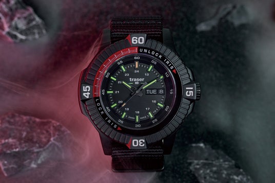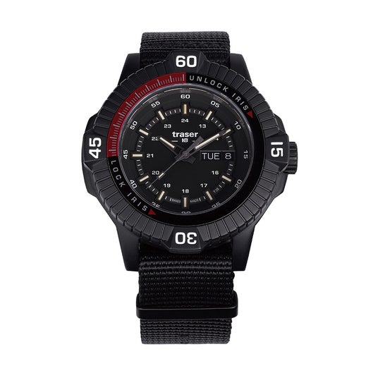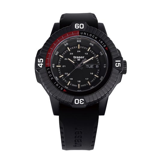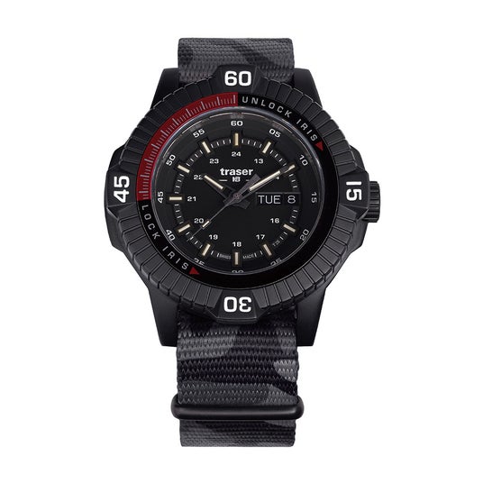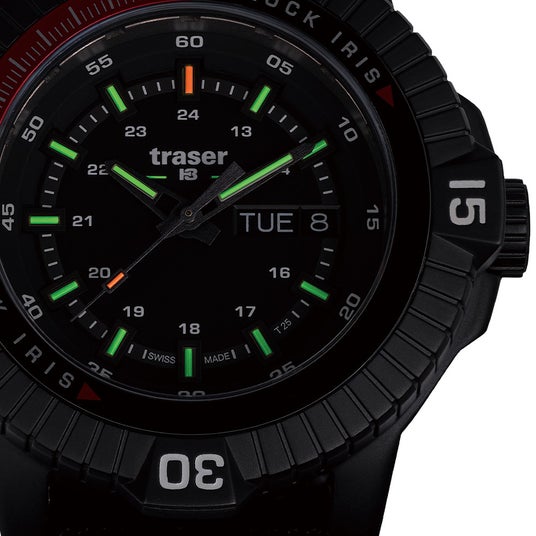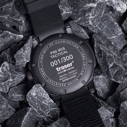 「P99 Iris Tactical」は、特殊部隊が直面する多くの課題に合わせて調整されたツールウォッチで、炭素繊維で強化されたアウターケースとPVD加工を施したステンレススチール製のインナーケースは衝撃、落下、振動に優れた耐性を発揮。また、軍用機器にも利用される「traser」の特長、「trigalight」の自己発光で10年間以上光り続けるシステムを継承しつつアップグレード。「trigalight」へ特許を取得した金属コーティングを施す事により従来より20%以上明るさを向上させた「Super Powered trigalight(スーパーパワード・トリガライト)」を初搭載。更に、特許技術である文字盤にある16枚の絞り羽は、特殊部隊の隠密行動をサポートするべく、ベゼルの動きと連動してカメラの絞りのように滑らかに開閉するギミックとなっており、他にない使用感となっています。日常生活、夜間のドライブなど、発光量を制限したい場合などに役立ちます。