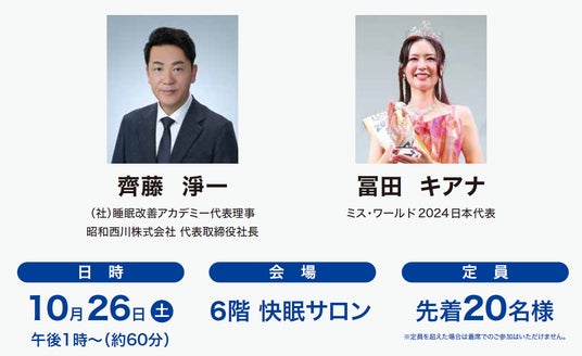 昭和西川代表取締役社長であり、(社)睡眠改善アカデミー代表理事を務める齊藤淨一とミス・ワールド2024日本代表・冨田キアナさんがトークセッションスタイルで日本の睡眠の現状とその役割などをお話しします。