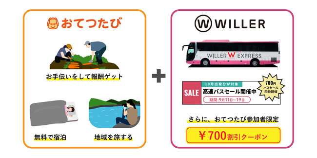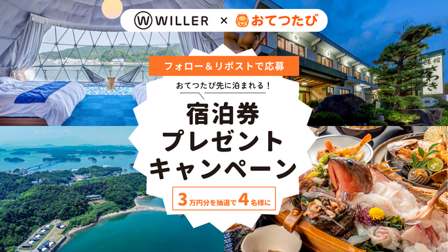 人手不足を“地域との出会い”に変えるマッチングサイト『おてつたび』を運営する株式会社おてつたび(本社:東京都渋谷区、代表取締役:永岡里菜、以下「おてつたび」)は、WILLER MARKETING株式会社(本社:大阪府大阪市、代表取締役社長:辻本 宗男、以下「WILLER」)と連携し、予約サイト「WILLER TRAVEL」(以下、「WILLERサイト」)で使える700円分のWEBクーポンをおてつたび参加者が貰えるキャンペーン、そしておてつたび先の旅館・ホテルの宿泊招待券が当たるSNSキャンペーンを実施します。
