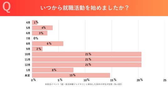 上記のグラフは体育会系学生の就職活動開始時期を示したものです。一般的な就職活動と比べ、体育会系学生はスタートが遅くなる傾向があり、「10月・11月・12月」に開始する学生がそれぞれ21%と最も多く、全体の約8割がこの時期に就職活動を始めていることが分かります。