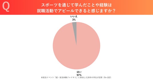 体育会系学生の97%が「スポーツを通じて学んだことや経験は、就職活動でアピールできる」と感じていることが明らかになりました。一方、「アピールできない」と回答した学生はわずか3%にとどまり、多くの体育会系学生が競技経験を自らの強みと捉えていることがわかります。