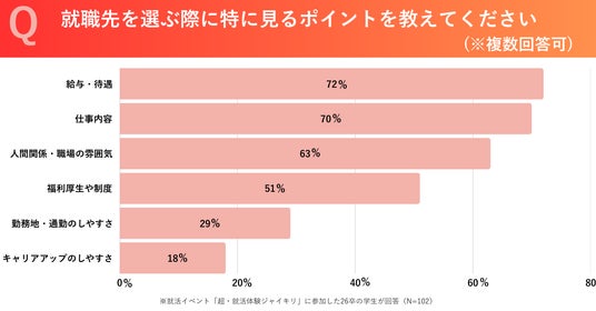 本イベントに参加した102名の学生を対象に、就職活動に関する実態調査を実施し、その結果を発表いたします。本調査では、就職先を選ぶ際の重視ポイントや、希望する業界・職種に対する意識が明らかになりました。