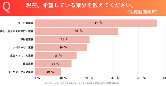 アンケート結果によると、体育会系学生が希望する就職先として最も多かったのは「サービス業界」47%でした。次いで、「商社(総合・専門)」32%、「不動産業界」21%、「人材サービス業界」20%と続きます。これらの業界はいずれも対人スキルやチームワークが求められる分野であり、体育会系学生の強みが活かせることがうかがえます。