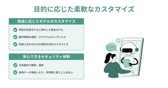 検出対象データの取り扱いに対しセキュリティ面での制約や懸念がある場合でも、KeiganAIでは、データの送信先制限や学習データとして利用させない制限を柔軟にカスタマイズします。機密性の高いデータを扱う現場でも安心してご利用いただけます。