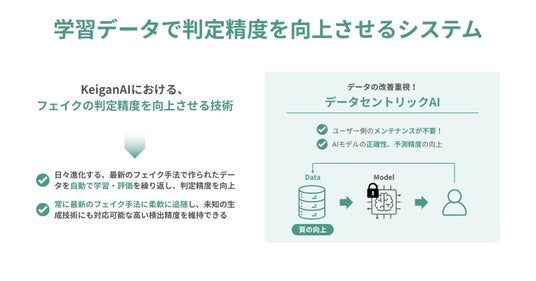 AIモデルそのものの改良に重きを置くモデルセントリックなアプローチではなく、学習データに重きを置くデータセントリックなAIシステム基盤を採用しています。これにより、未知の生成手法が登場した際も、その生成手法特有の特徴を含む学習データを拡充しトレーニングをすることで、新たな脅威に対しても迅速な検出対応が可能となります。