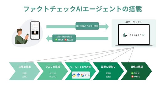 ファクトチェックではAIエージェントを搭載し、1.主張の抽出、2.検証クエリの自動生成、3.外部情報ソースへの送信、4.証拠情報の取得、5.真偽の判定という一連のチェックプロセスをAIエージェントが自律的に行っています。