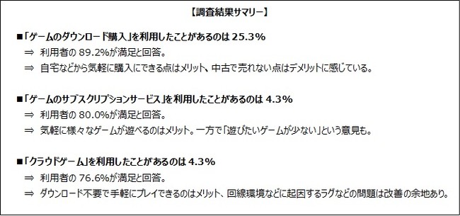 このように、「ゲームのダウンロード購入」「ゲームのサブスクリプションサービス」「クラウドゲーム」など新形態のサービス利用者は、先進性が高いと思われているゲームユーザーの中でもまだまだ少数派ではありますが、利用したゲーマーの満足度は総じて高いということがわかりました。