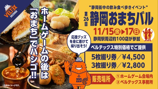 また、特別価格チケットをお買い求めのブースターの皆様には、11/16(土)17(日)静岡市中央体育館でのホーム福岡戦にご来場後、「ベルテックス静岡応援アイテムを着用」のうえ静岡おまちバルにご参加いただき、一般参加の皆様にベルテックス静岡の魅力をPRいただきますようお願いいたします。