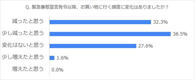 回答者のうちの71%が、緊急事態宣言発令を受けて「お買い物に行く頻度は、減ったと思う」もしくは「お買い物に行く頻度は、少し減ったと思う」と回答しました。